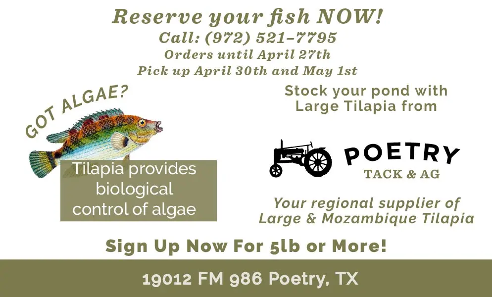 If you or someone you know struggles with algae in their pond. Your solution is closer than you think. Tilapia provides control of algae in ponds. Reserve your fish by April 27th by calling 972-521-7795. Pick up at Poetry Tack and Ag April 30th and May 1st.